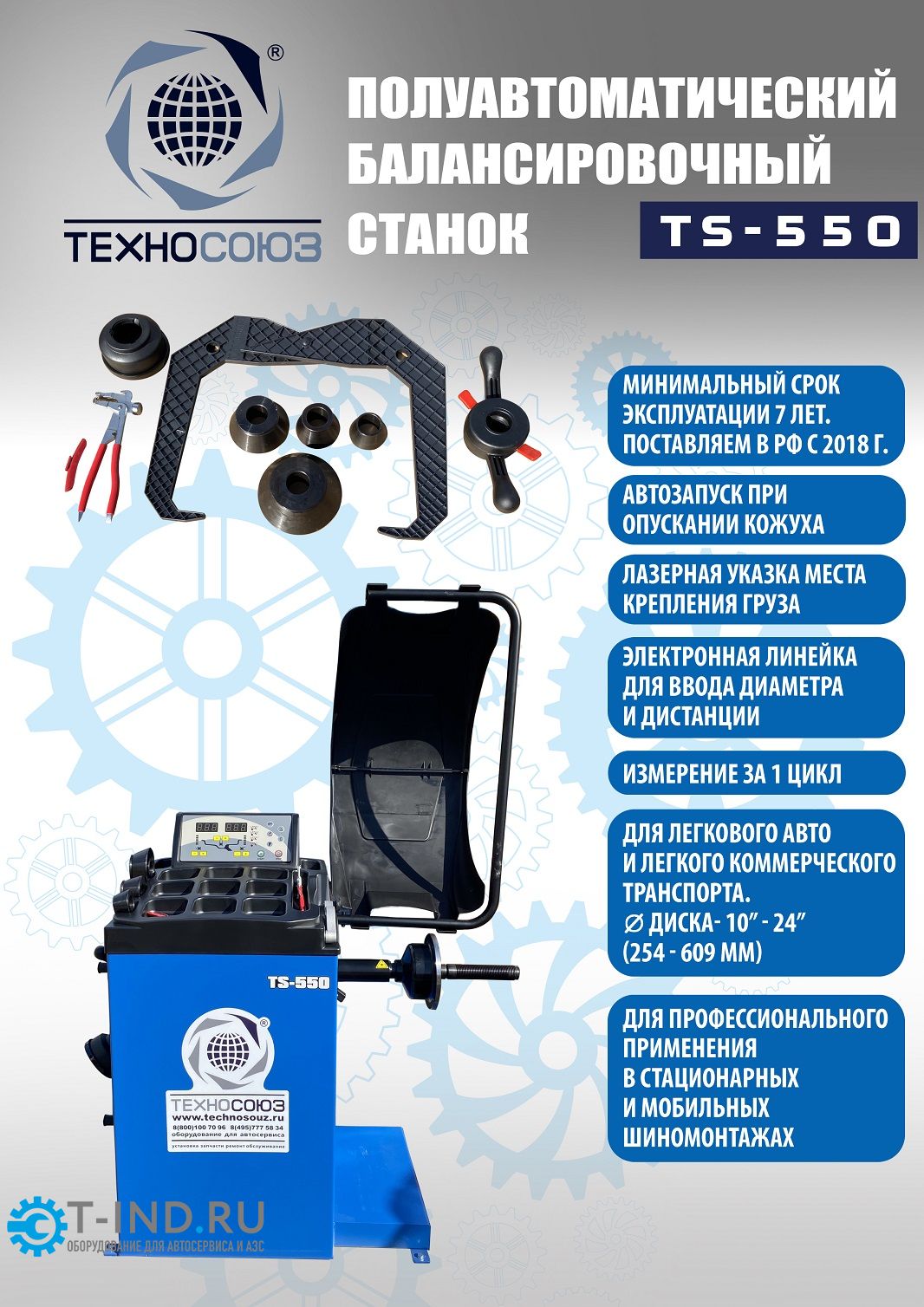 Балансировочный станок Техносоюз TS-550 для колес легковых автомобилей, мотоциклов, «Газелей», «Спринтеров» и т.п. от 10–24” Ø покрышки ≤ 760 мм, вес ≤ 65 кг. Автозапуск опусканием кожуха. Автоматический ввод дистанции и диаметра диска. Режимы работы DINAMIC, STATIC, ALU1, ALU2, ALU3, ALUS, ST. Автокалибровка.