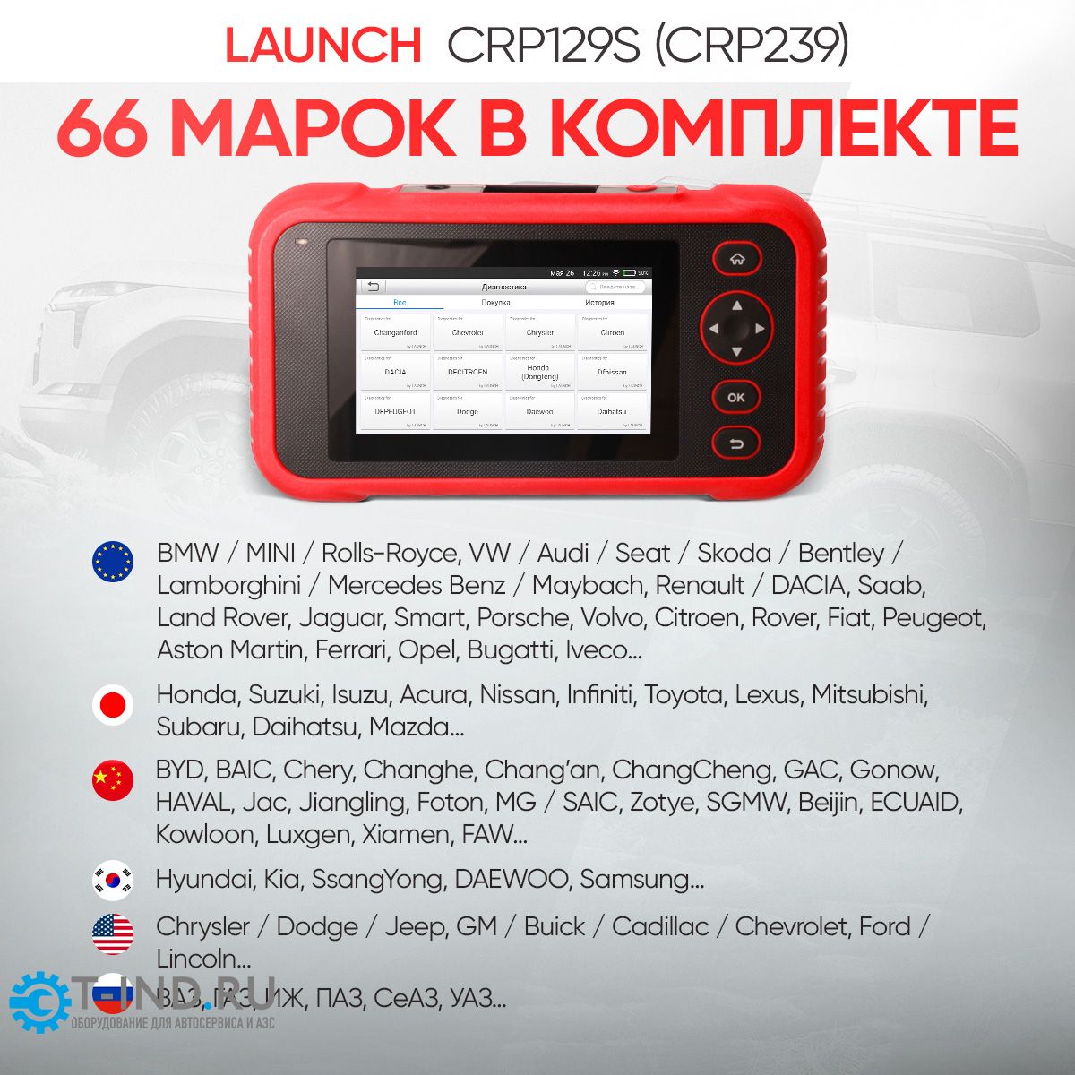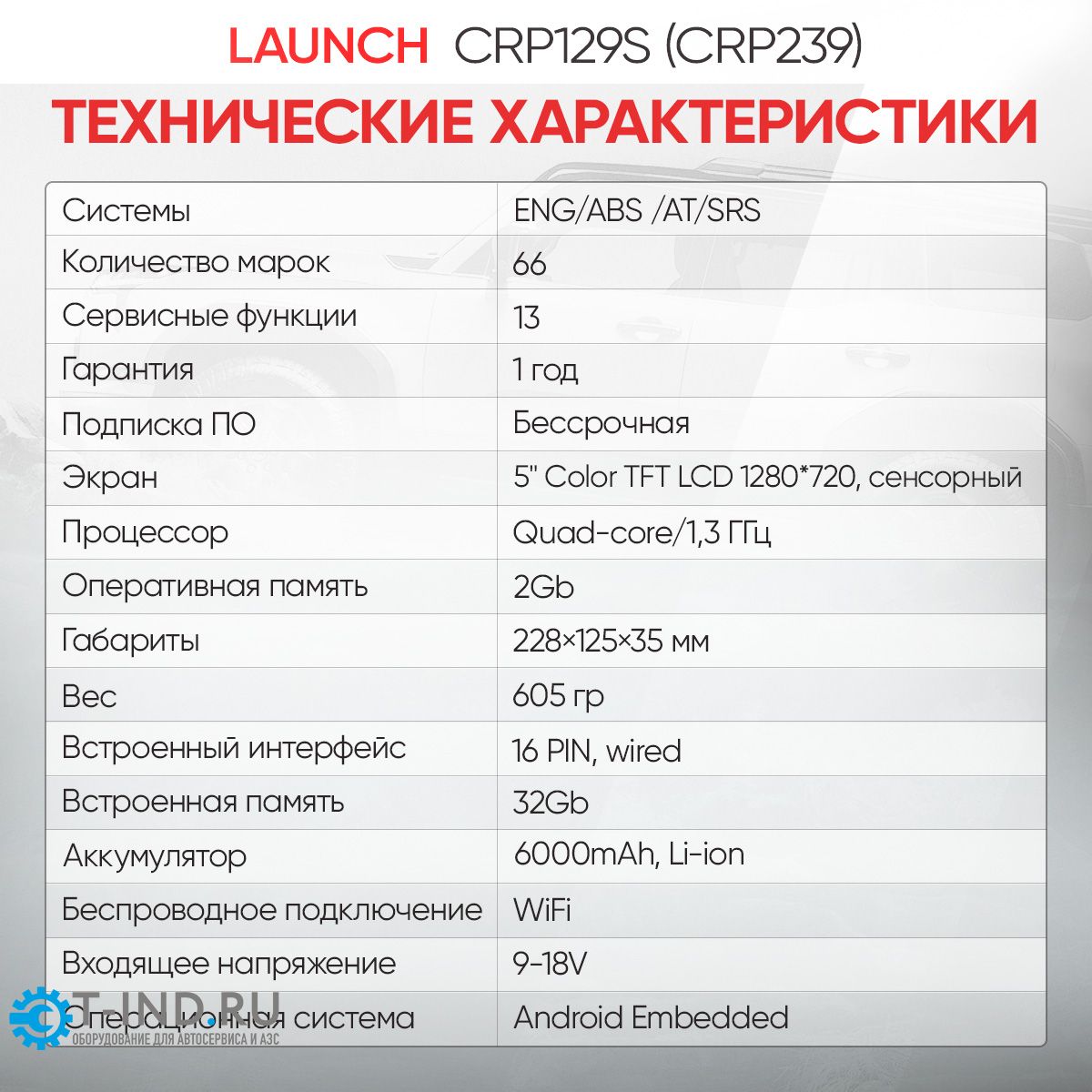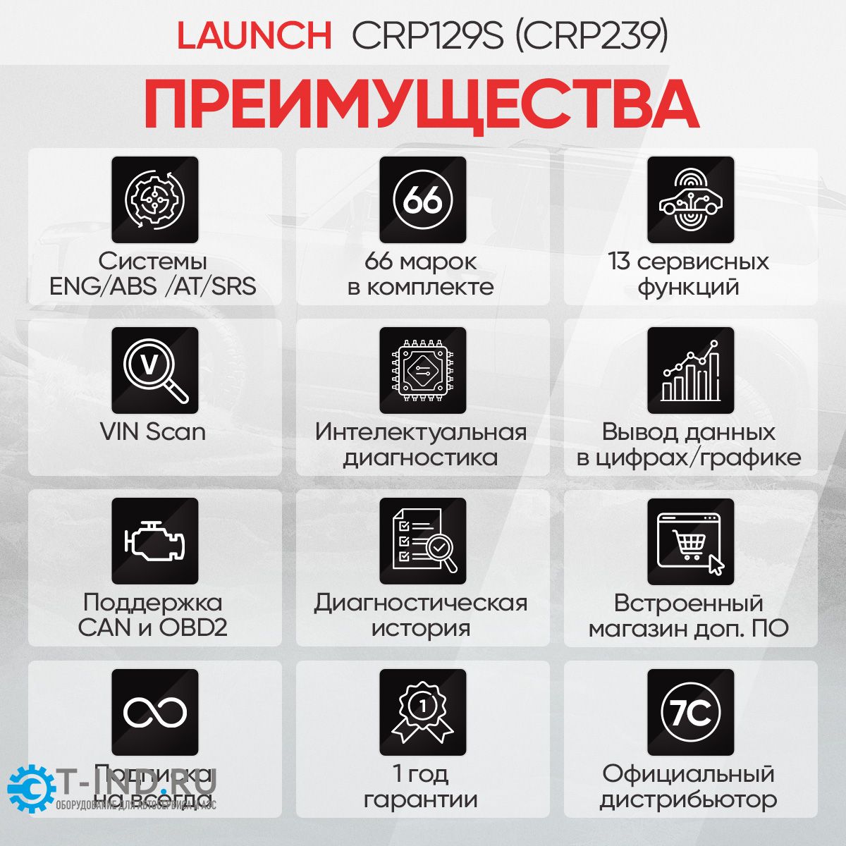 Launch CRP129S — это обновлённая версия портативного сканера Launch CRP239 на платформе Android. Теперь в комплект входят 13 сервисных функций, увеличенный аккумулятор ёмкостью до 6000 mAh и встроенная память объёмом до 32 GB. В остальном это тот же сканер, ориентированный на личное использование и небольшие СТО, с помощью которого вы сможете продиагностировать такие системы, как ENG, ABS, AT, SRS, а также провести диагностику по протоколу OBD-II.