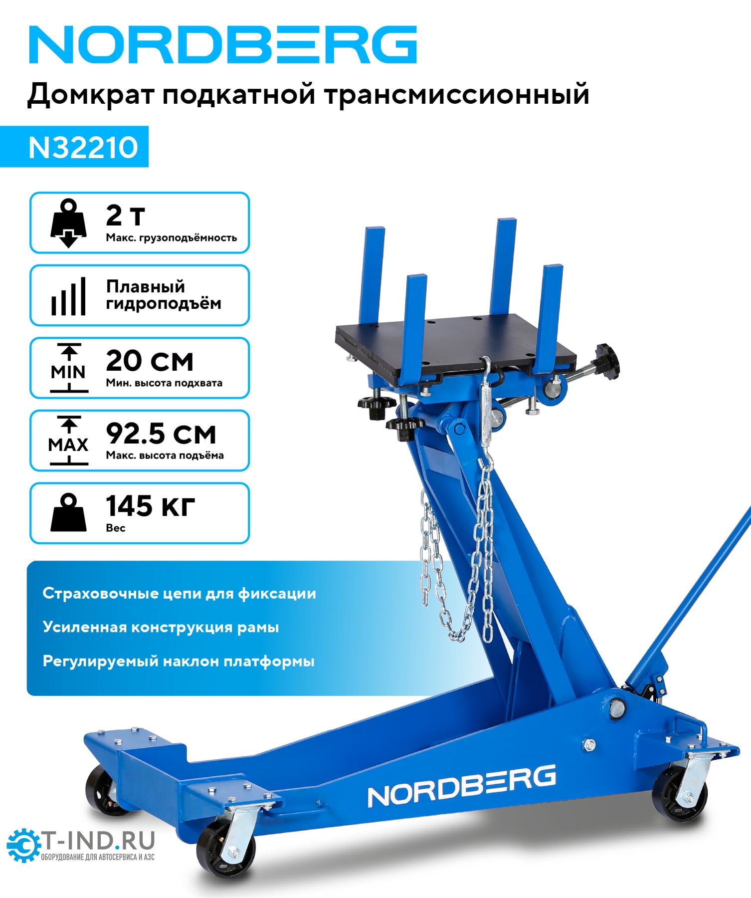 NORDBERG N32210 — профессиональный подкатной трансмиссионный домкрат, предназначенный для работы с агрегатами трансмиссии в автосервисах, мастерских и ремонтных зонах. Предназначено для подъёма, удержания и точного позиционирования коробок передач и других агрегатов трансмиссионной группы массой до 2 тонн при монтаже и демонтаже.