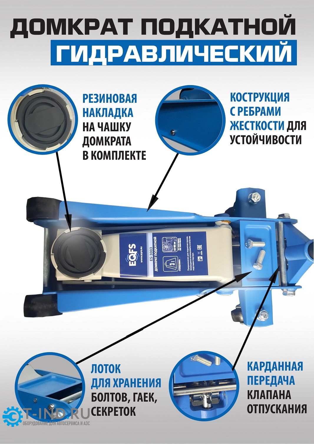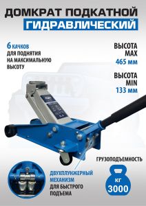 Профессиональный домкрат подкатной гидравлический 3 тонны EQFS ES-3003, автомобильный. Для интенсивной эксплуатации. 6 качков для поднятия на максимальную высоту. Двухштоковый механизм быстрого подъема. Подкатной. Имеет повышенную износостойкость. Поворотная ручка, лоток для хранения и резиновая накладка на чашку домкрата в комплекте. Грузоподъемность 3 тонны с усиленными ребрами жесткости. Высота подъема 133-465 мм. Вес: 31,5 кг.