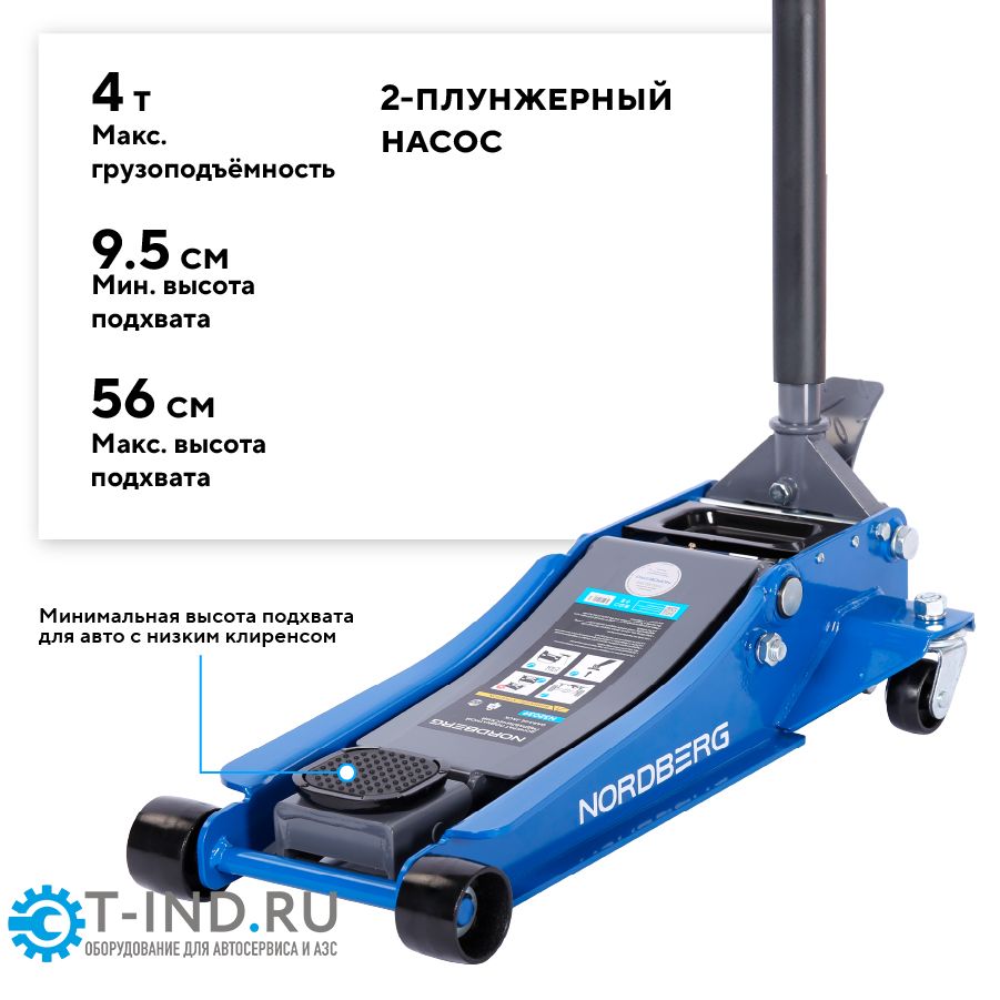 NORDBERG N32039 — домкрат подкатной 4 т с низким подхватом и педалью. Предназначен для технического обслуживания, ремонта и замены колёс легковых и лёгких коммерческих автомобилей на ровной твёрдой поверхности. Обеспечивает безопасный и устойчивый подъём, что позволяет надёжно установить опорные стойки.