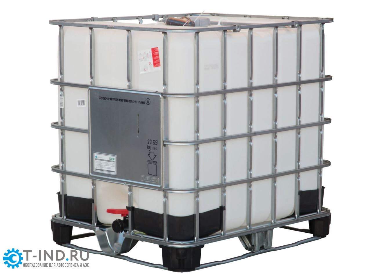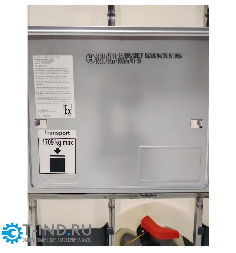Ёмкость кубическая (IBC-контейнер, кубовая ёмкость, кубовый контейнер) с заземлением. Для транспортировки и хранения легковоспламеняющихся жидкостей с температурой возгорания ниже 61°C, в т.ч. ацетона, керосина и бензина.