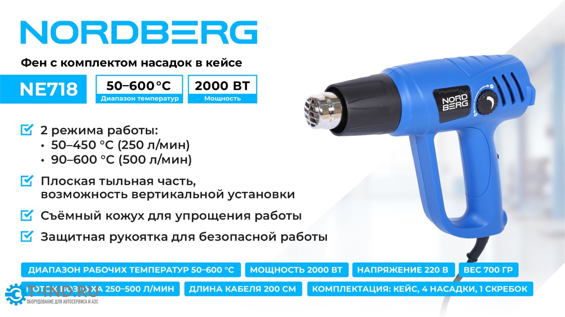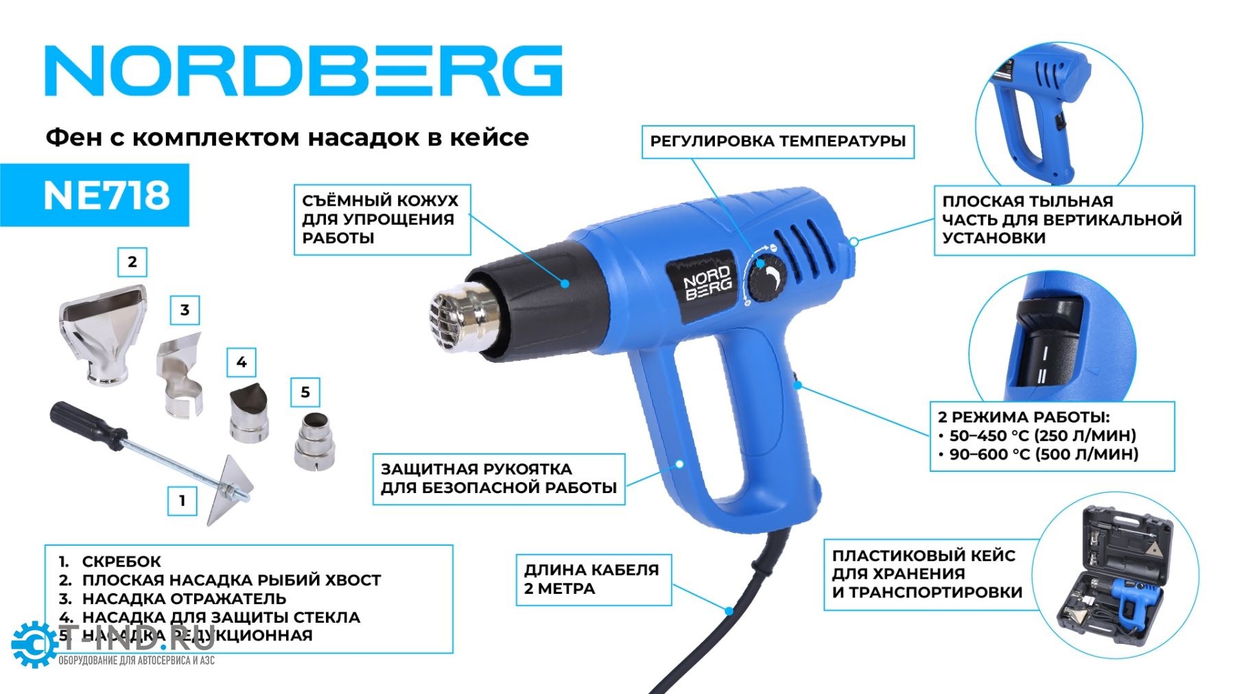 Технический фен NORDBERG NE718 – электроинструмент для работы с различными материалами в автосервисах, СТО, на промышленных предприятиях, в частных гаражах и для бытового применения. Предназначен для создания потока горячего воздуха в диапазоне от 50 до 600 °С.
