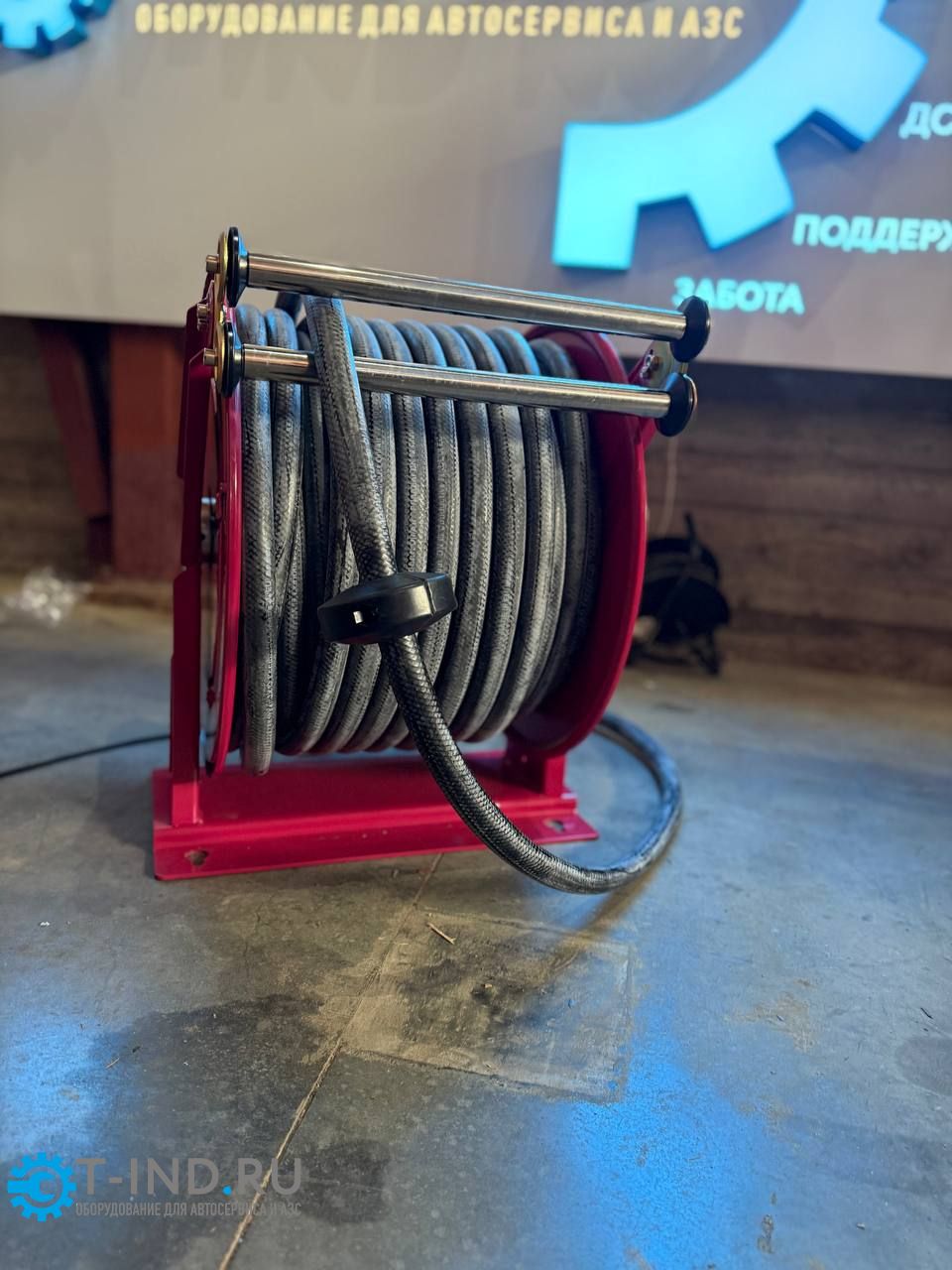 Встроенный механизм автоматического сматывания позволяет обслуживать заправочный комплекс 1 человеку, при этом используется только необходимая длина шланга. Специальный направляющий кронштейн обеспечивает правильную укладку рукава и предупреждает самопроизвольное спадание шланга с барабана.