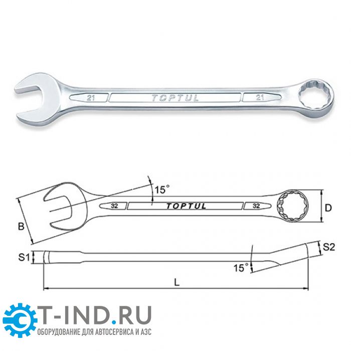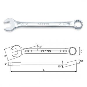 Накидная 12-гранная часть ключа изогнута под углом 15° для удобной работы с гайками и головками болтов
