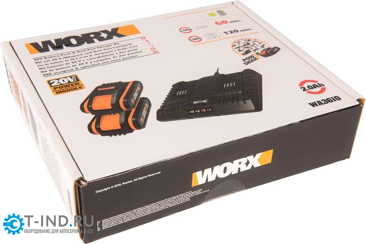 WA3610 – это универсальный комплект для всех аккумуляторных инструментов WORX в линейке вольтажа 20В. Комплект состоит из двух литий-ионных батарей Powershare 2Ач и двойного зарядного устройства WA3869.