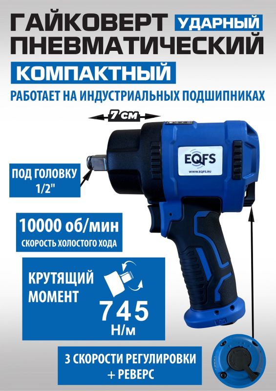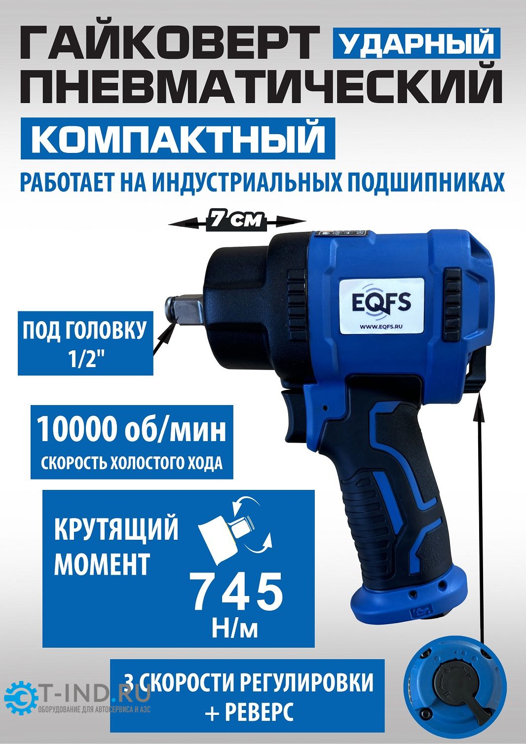 - Пневмогайковерт ударный короткий EQFS ES-7124, 1/2", легковой, 745 Нм- 1шт.