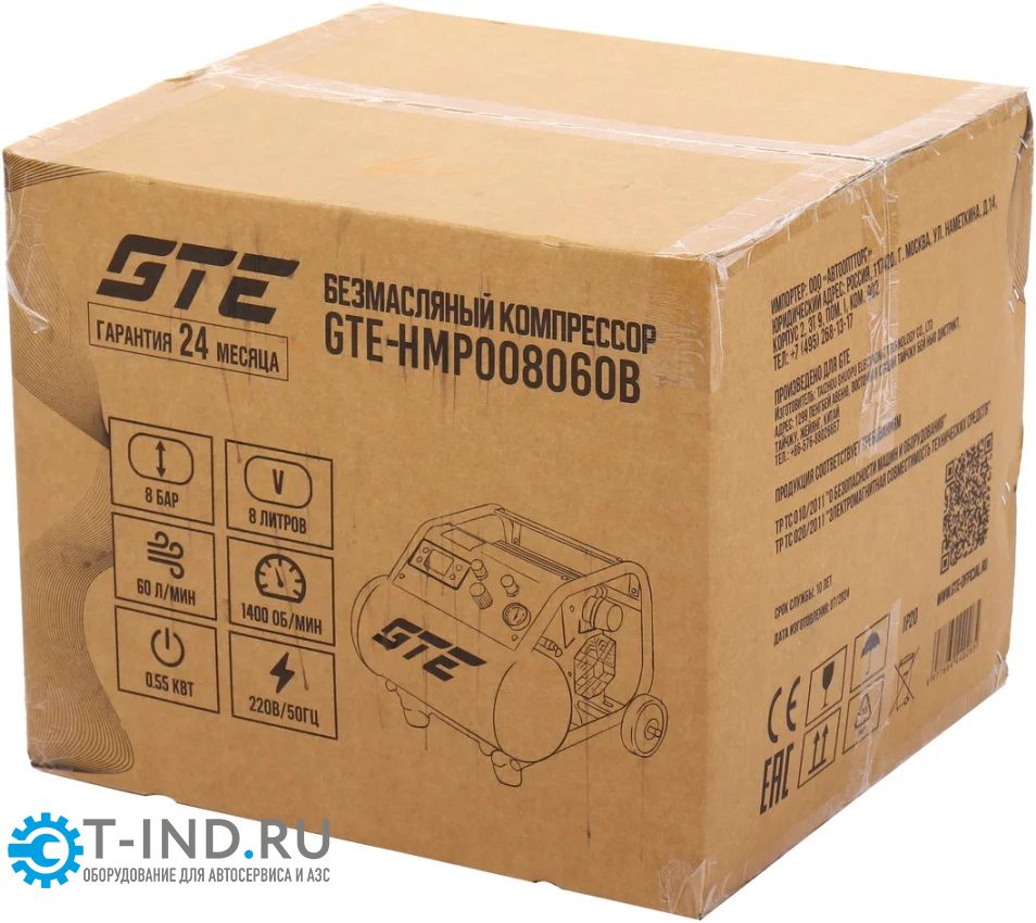 Поршневой компрессор GTE GTE-HMP008060B, поршневой безмасляный, 60л/мин, 8л, 220В