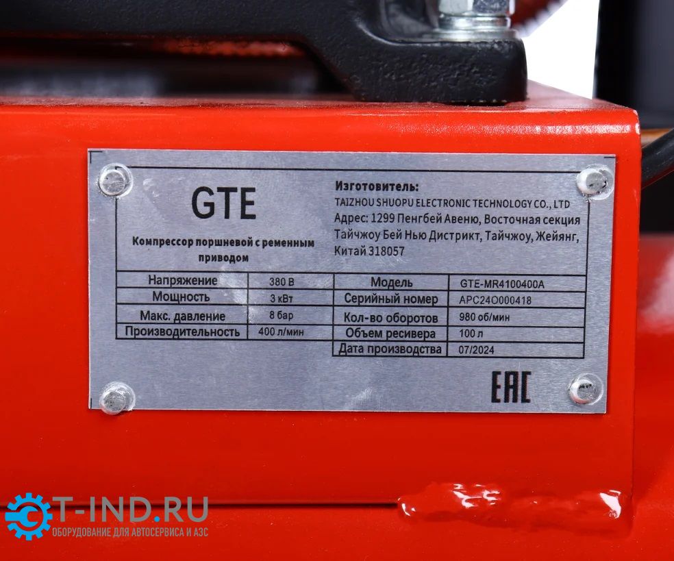 Поршневой компрессор GTE GTE-MR4100400A, ременной, 400л/мин, 100л, 380В