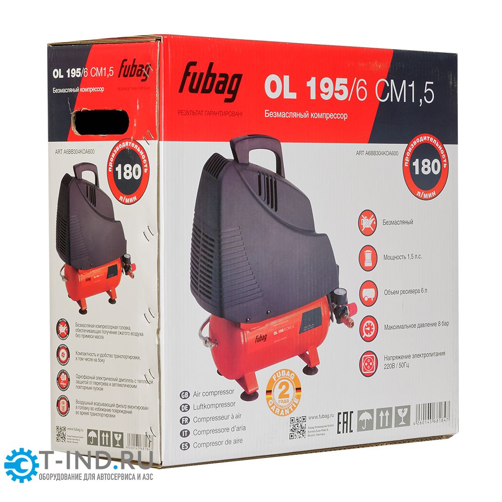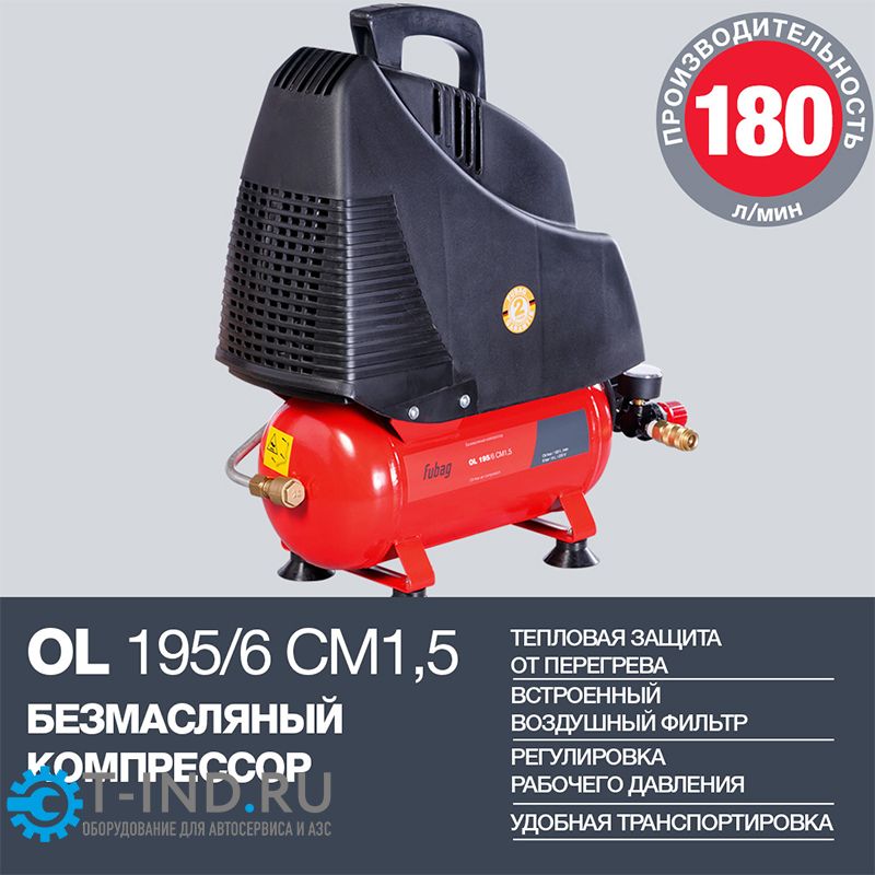Поршневой компрессор Fubag OL 195/6 CM1.5, прямой безмасляный, 220В, 180л/мин, 6л