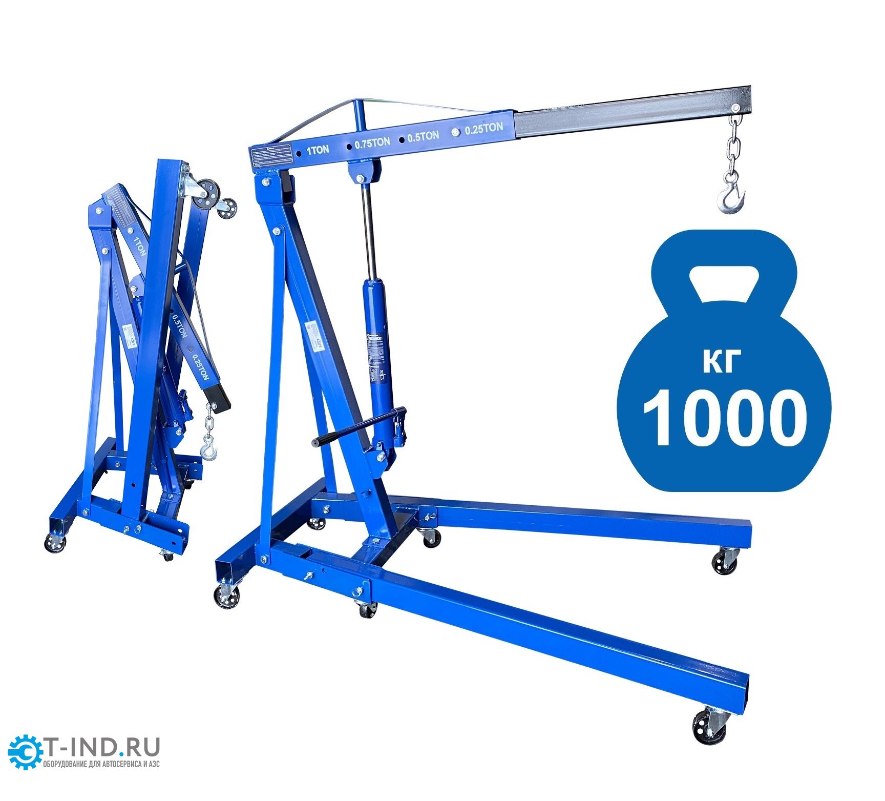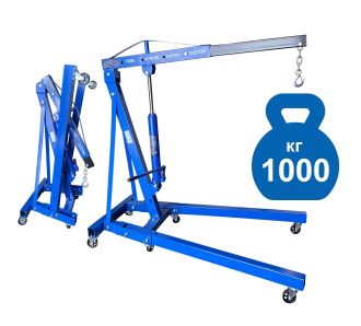 Поднимает 99% двигателей легковых и Джипов в РФ. Профессиональный. Складной. Для подъема и транспортировки узлов, агрегатов и любых других грузов как внутри помещения, так и на улице. Вынос стрелы с цепью и крюком регулируется в соответствии с максимальной грузоподъемностью крана. Грузоподъемность 1т.