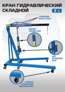 Кран гаражный гидравлический складной грузоподъемность 2т. Силовой цилиндр усилием 8 тонн. Для подъема и транспортировки автомобильных узлов, агрегатов и любых других грузов как внутри помещения, так и на улице. Вынос стрелы регулируется в соответствии с максимальной грузоподъемностью крана – 500-1000-1500-2000кг. Рабочим приводом крана является гидроцилиндр (усилие 8 тонн). Устройство полностью автономно, не требует дополнительных конструкций.