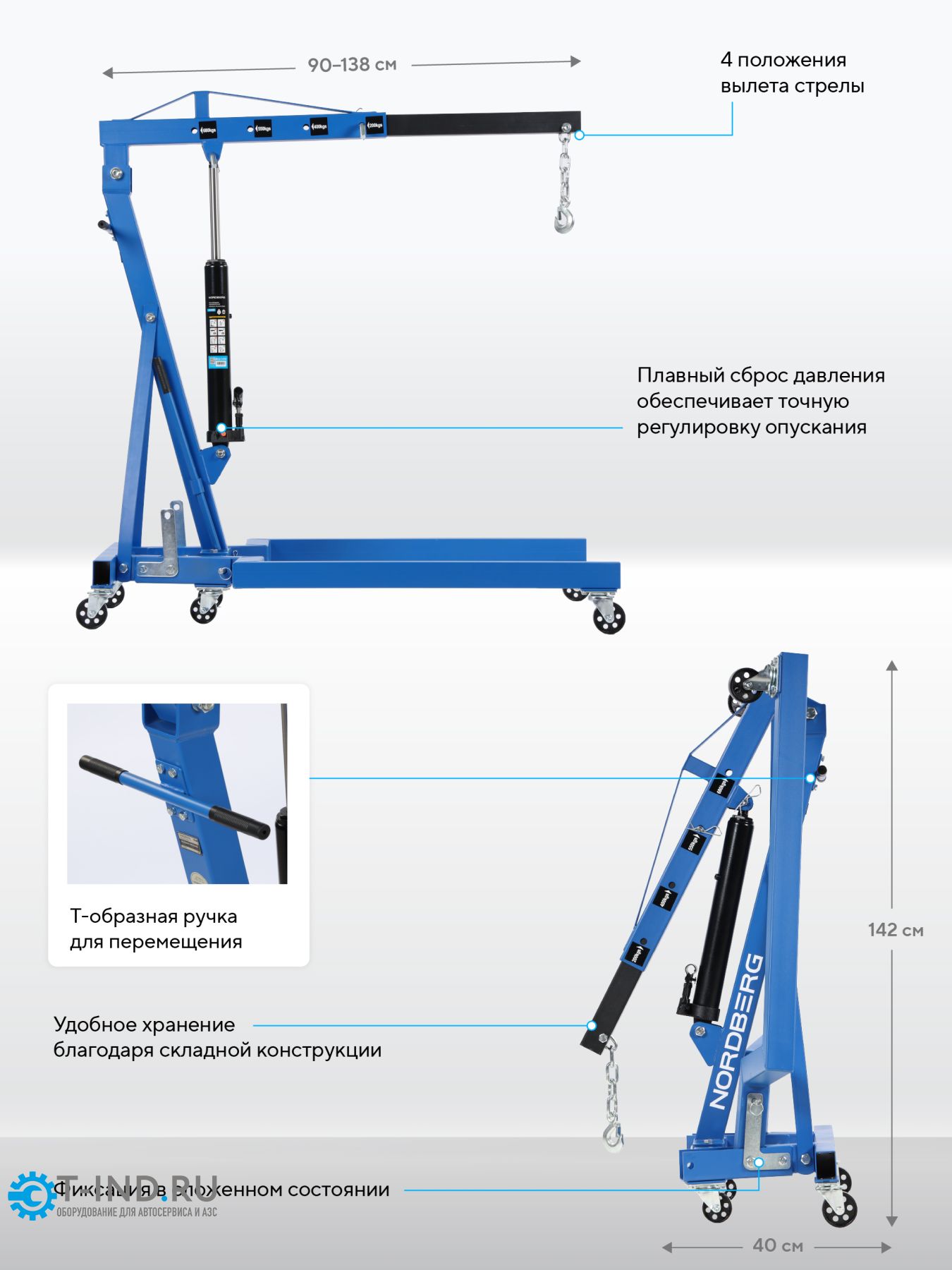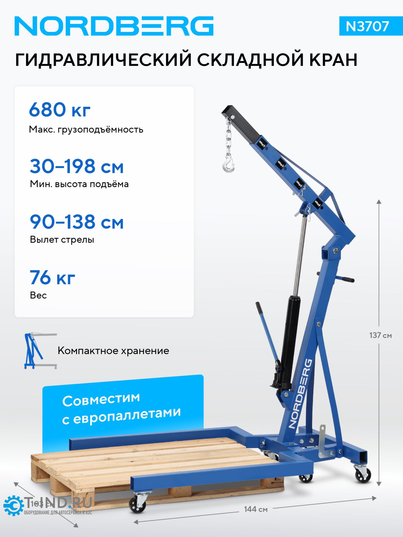 NORDBERG N3707 — складной гидравлический кран под паллеты. Предназначен для подъёма и перемещения автомобильных узлов, агрегатов и других грузов массой до 680 кг. Работа выполняется вручную — подъём и опускание осуществляются с помощью гидроцилиндра с ручным насосом.
