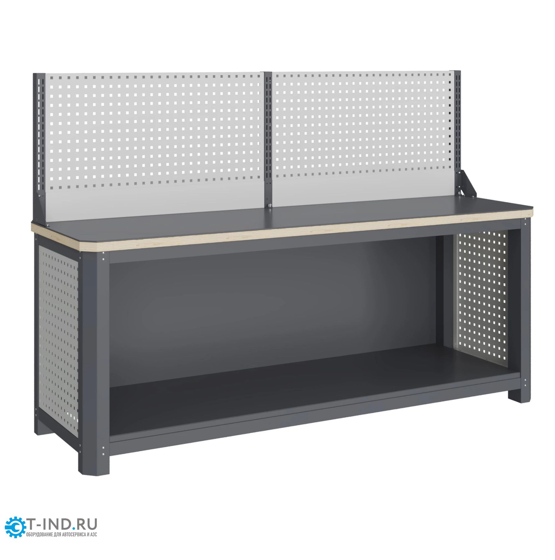 столешницы шириной 1993 мм, рамы верстака, состоящей из опор, перемычек, боковых перфопанелей, четырех комплектов полка-стенка SW1, одинарного экрана с кронштейнами.