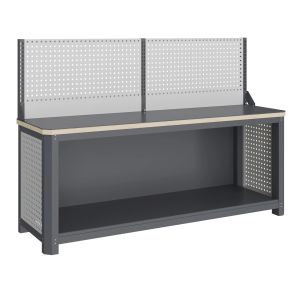 Экран (перфорированная панель) верстака выполнен с квадратной перфорацией 12х12 мм с шагом 38 мм для установки крючков, держателей и других аксессуаров. Экран крепятся к столешнице с помощью специальных кронштейнов. Максимальная масса груза, равномерно распределенного по поверхности экрана, составляет 71 кг.