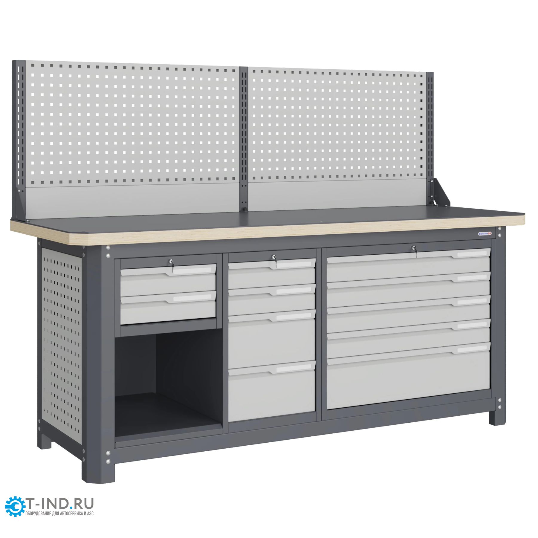 столешницы шириной 1993 мм, рамы верстака, состоящей из опор, перемычек, боковых перфопанелей, малого подвесного модуля S2, малого модуля S4, большого модуля L5, комплекта полка-стенка SW2, одинарного экрана с кронштейнами.
