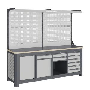 столешницы шириной 1993 мм, рамы верстака, состоящей из опор, перемычек, боковых перфопанелей, малых модулей S6, S7, S8 и S2 с комплектом полка-стенка SW2, двойного экрана с кронштейнами и комплектом навесок.