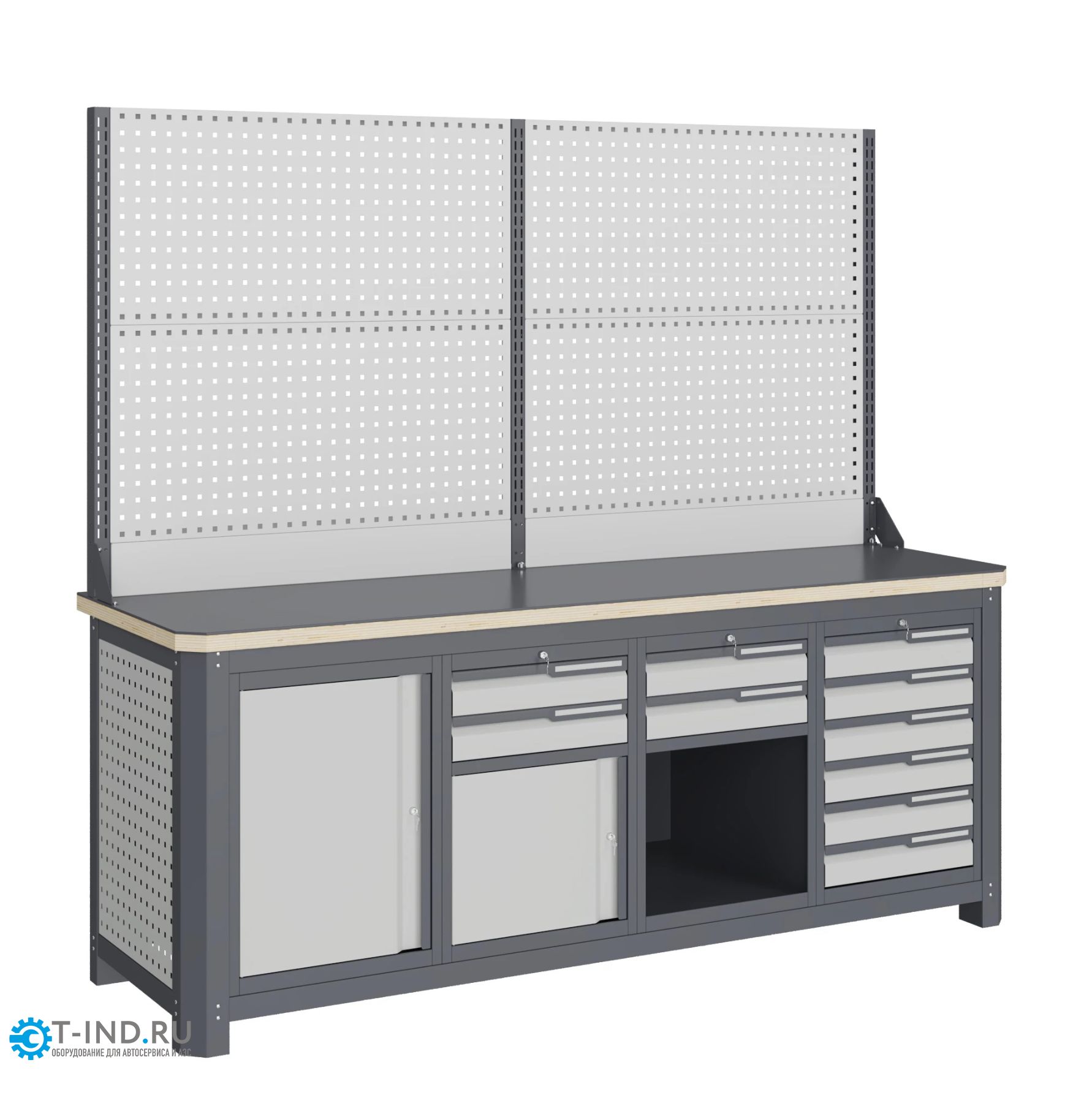 столешницы шириной 1993 мм, рамы верстака, состоящей из опор, перемычек, боковых перфопанелей, малых модулей S6, S7, S9, S2 и комплекта полка-стенка SW2, двойного экран с кронштейнами.
