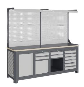 Квадратная перфорация на элементах верстака предназначена для установки крючков, держателей и других аксессуаров, имеет размеры: квадрат 12х12мм. шаг 38мм. Экран (перфорированная панель) верстака выполнен с квадратной перфорацией 12х12 мм с шагом 38 мм для установки крючков, держателей и других аксессуаров. Экран крепятся к столешнице с помощью специальных кронштейнов. Максимальная масса груза, равномерно распределенного по поверхности экрана, составляет 71 кг. Комплект освещения устанавливается над верстаком. В комплекте идет защитный козырек, кронштейны и лампа с магнитными креплениями, которые позволяют менять ее положение.