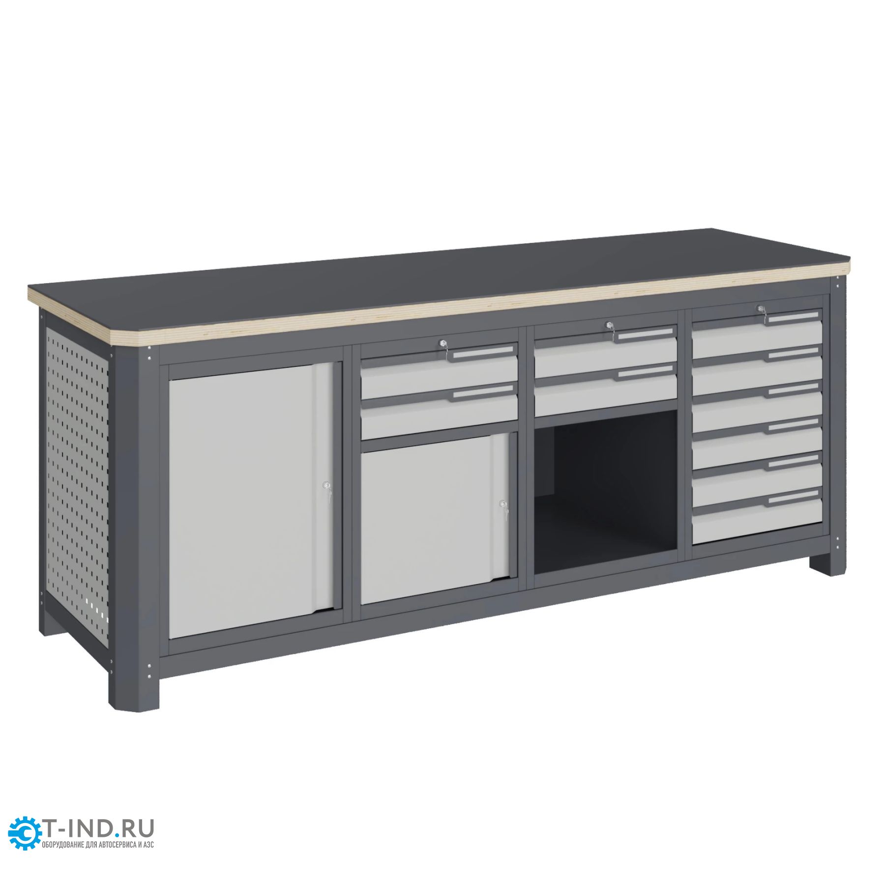 столешницы шириной 1993 мм, рамы верстака, состоящей из опор, перемычек, боковых перфопанелей, малых модулей S6, S7, S9, S2 и комплекта полка-стенка SW2.