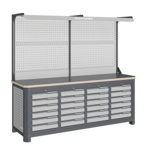Модули с ящиками снабжены общим центральным замком с поворотом ригеля 180 градусов и подпружиненной тягой. В комплекте два ключа для каждого замка. Квадратная перфорация на элементах верстака предназначена для установки крючков, держателей и других аксессуаров, имеет размеры: квадрат 12х12мм. шаг 38мм. Экран (перфорированная панель) верстака выполнен с квадратной перфорацией 12х12 мм с шагом 38 мм для установки крючков, держателей и других аксессуаров. Экран крепятся к столешнице с помощью специальных кронштейнов. Максимальная масса груза, равномерно распределенного по поверхности экрана, составляет 71 кг. Комплект освещения устанавливается над верстаком. В комплекте идет защитный козырек, кронштейны и лампа с магнитными креплениями, которые позволяют менять ее положение.
