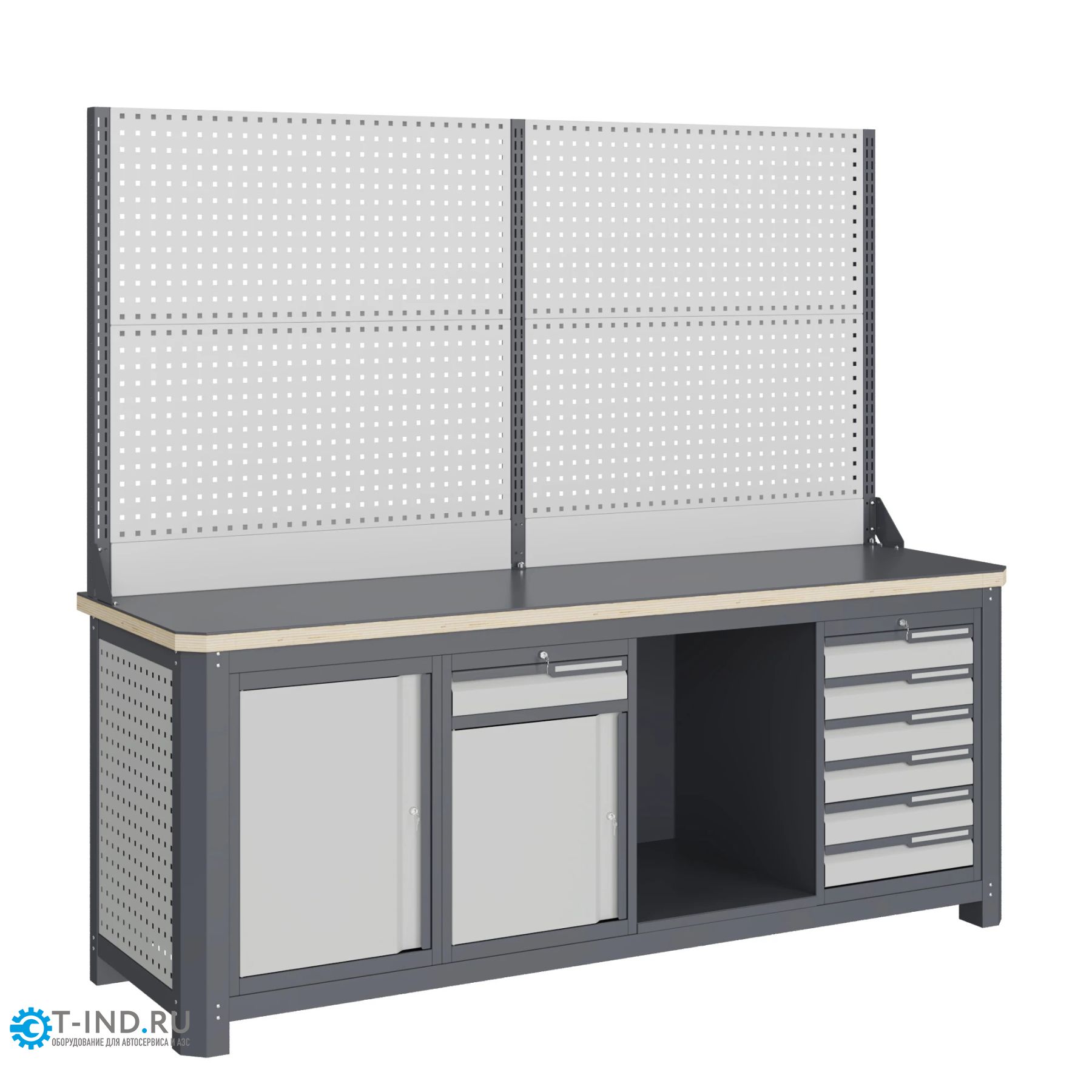 столешницы шириной 1993 мм, рамы верстака, состоящей из опор, перемычек, боковых перфопанелей, малых модулей S6, S7, S8 и комплекта полка-стенка SW1, двойного экрана с кронштейнами.