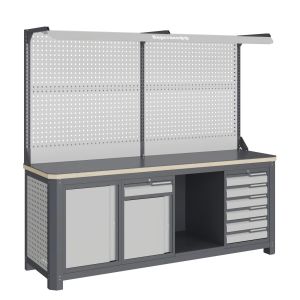 Модули с ящиками снабжены общим центральным замком с поворотом ригеля 180 градусов и подпружиненной тягой. В комплекте два ключа для каждого замка. Квадратная перфорация на элементах верстака предназначена для установки крючков, держателей и других аксессуаров, имеет размеры: квадрат 12х12мм. шаг 38мм. Экран (перфорированная панель) верстака выполнен с квадратной перфорацией 12х12 мм с шагом 38 мм для установки крючков, держателей и других аксессуаров. Экран крепятся к столешнице с помощью специальных кронштейнов. Максимальная масса груза, равномерно распределенного по поверхности экрана, составляет 71 кг. Комплект освещения устанавливается над верстаком. В комплекте идет защитный козырек, кронштейны и лампа с магнитными креплениями, которые позволяют менять ее положение.