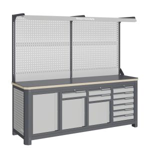В комплекте два ключа для каждого замка. Квадратная перфорация на элементах верстака предназначена для установки крючков, держателей и других аксессуаров, имеет размеры: квадрат 12х12мм. шаг 38мм. Экран (перфорированная панель) верстака выполнен с квадратной перфорацией 12х12 мм с шагом 38 мм для установки крючков, держателей и других аксессуаров. Экран крепятся к столешнице с помощью специальных кронштейнов. Максимальная масса груза, равномерно распределенного по поверхности экрана, составляет 71 кг. Комплект освещения устанавливается над верстаком. В комплекте идет защитный козырек, кронштейны и лампа с магнитными креплениями, которые позволяют менять ее положение.