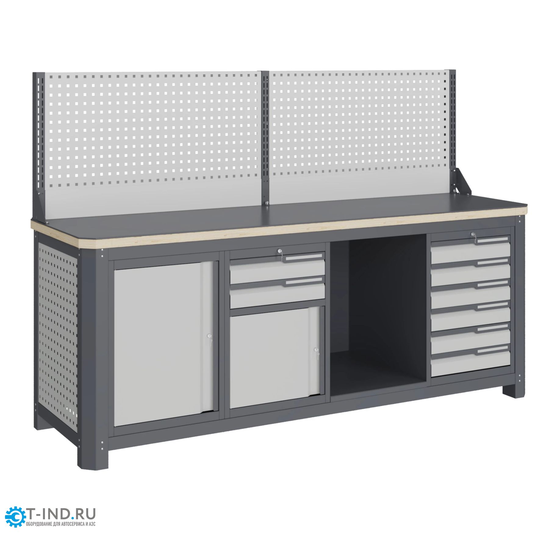 столешницы шириной 1993 мм, рамы верстака, состоящей из опор, перемычек, боковых перфопанелей, малых модулей S6, S7, S9 и комплекта полка-стенка SW1, одинарного экрана с кронштейнами.