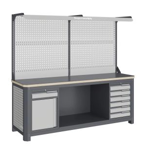 столешницы шириной 1993 мм, рамы верстака, состоящей из опор, перемычек, боковых перфопанелей, малых модулей S6, S8 и двух комплектов полка-стенка SW1, двойного экрана с кронштейнами с комплектом освещения.