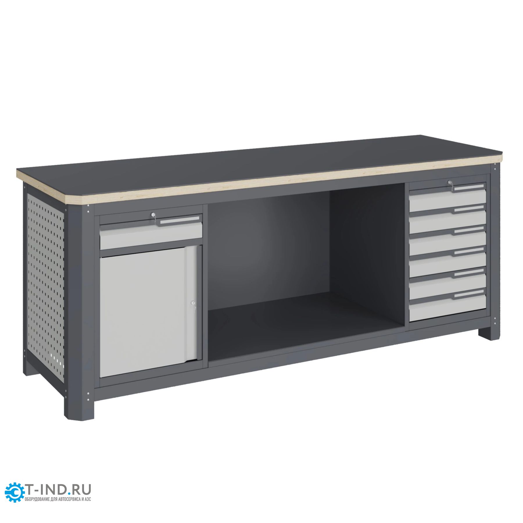 столешницы шириной 1993 мм, рамы верстака, состоящей из опор, перемычек, боковых перфопанелей, малых модулей S6, S8 и двух комплектов полка-стенка SW1.