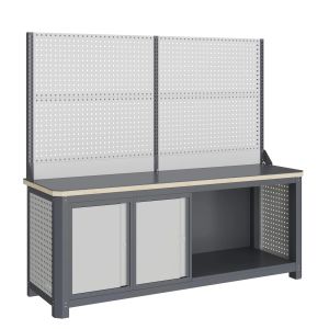столешницы шириной 1993 мм, рамы верстака, состоящей из опор, перемычек, боковых перфопанелей, двух малых модулей S7 и двух комплектов полка-стенка SW1, двойного экрана с кронштейнами.