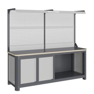 столешницы шириной 1993 мм, рамы верстака, состоящей из опор, перемычек, боковых перфопанелей, двух малых модулей S7 и двух комплектов полка-стенка SW1, двойного экрана с кронштейнами и комплекта освещения.