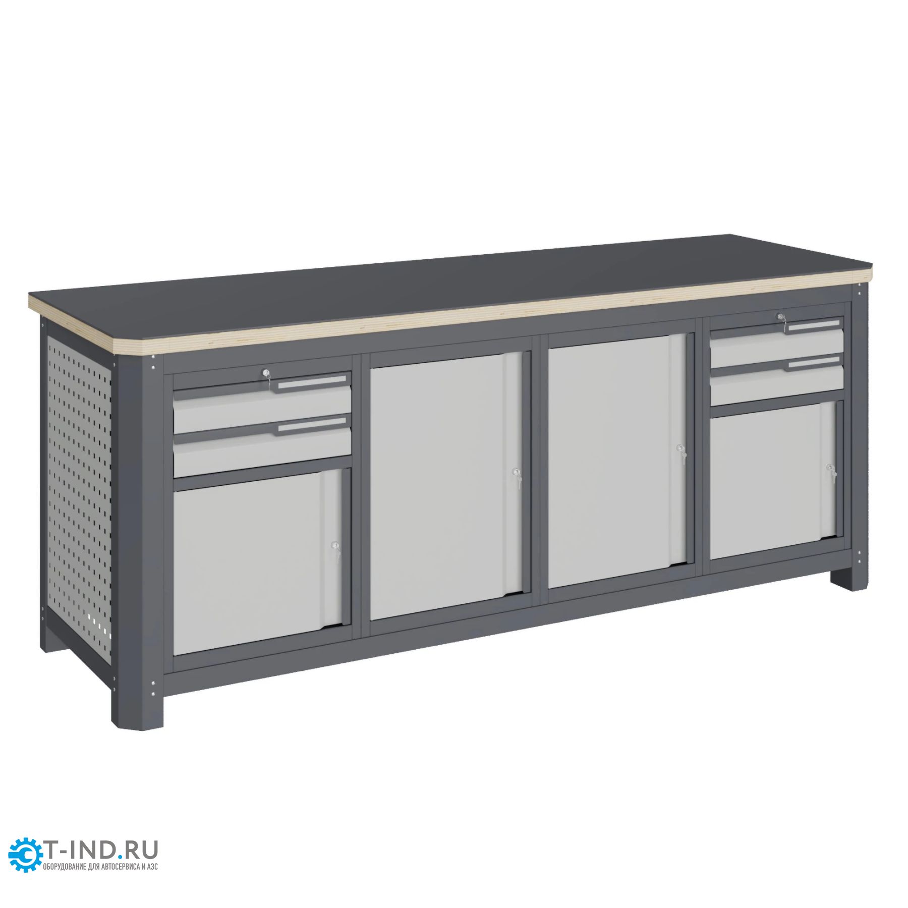 В комплекте два ключа для каждого замка. Квадратная перфорация на элементах верстака предназначена для установки крючков, держателей и других аксессуаров, имеет размеры: квадрат 12х12мм. шаг 38мм.