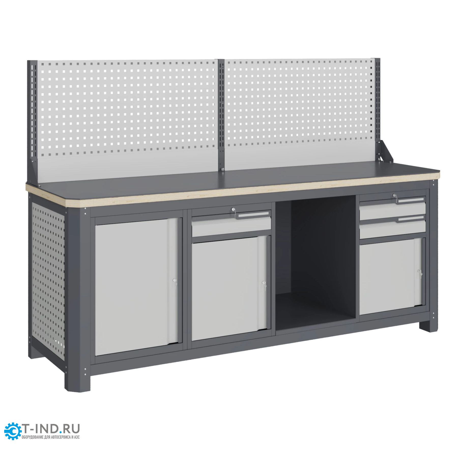 Столешница состоит из листа влагостойкой фанеры марки ФСФ толщиной 40 мм, которая покрыта лаком-антисептиком и листом горячекатаной стали толщиной 5 мм. Глубина столешниц 743 мм. Максимальная масса груза, равномерно распределенного по столешнице, составляет 1500 кг. Модуль верстака выполнен сварными. Ящики в модулях устанавливаются на шариковых телескопических направляющих полного выдвижения. В модуле S7 установлена дверь и две полки. Дверь имеет размеры (ВхШхГ), не более: 578 х 367 х 25 мм. Полка модуля имеет размеры (ВхШхГ), не более: 25 х 367 х 510 мм. Максимально допустимая масса груза, равномерно распределенного по поверхности полки 31 кг. В модуле S8 установлено один малый ящик и дверца. Внутренние размеры малого ящика (ВхШхГ), не более: 75 х 755 х 500 мм. Максимально допустимая масса груза, равномерно распределенного по поверхности любого выдвижного ящика 31 кг.