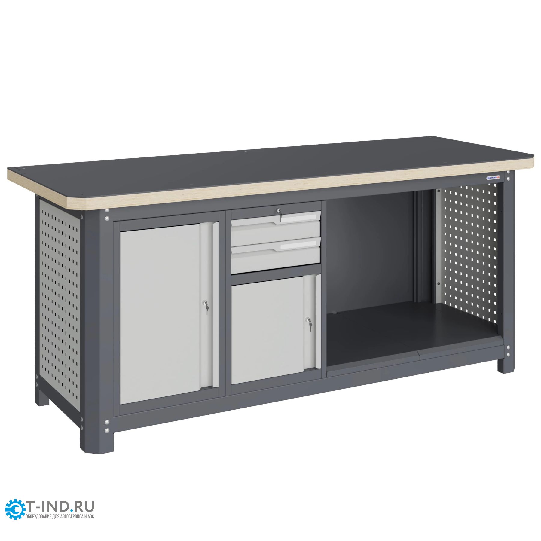 Предназначен для выполнения сборочных, ремонтных, слесарных, монтажных и других видов работ на производстве, в сервисных центрах, мастерских, гаражах. Рама верстака выполнена их холоднокатаной стали. Опоры допускают частичную регулировку по высоте для компенсации неровности пола. Все металлические элементы покрыты полиэфирной порошковой краской, обеспечивающей хорошую износостойкость покрытия и невосприимчивость его к моющим средствам и смазочным веществам. Верстак имеет декларацию соответствия ТР ТС 025/2012 «О безопасности мебельной продукции». Верстак имеет сертификат соответствия ГОСТ Р 58863-2020 «Столы производственные. Верстаки из металла. Общие технические условия». Столешница состоит из листа влагостойкой фанеры марки ФСФ толщиной 40 мм, которая покрыта лаком-антисептиком и листом горячекатаной стали толщиной 5 мм. Глубина столешниц 743 мм.