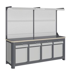 Квадратная перфорация на элементах верстака предназначена для установки крючков, держателей и других аксессуаров, имеет размеры: квадрат 12х12мм. шаг 38мм. Экран (перфорированная панель) верстака выполнен с квадратной перфорацией 12х12 мм с шагом 38 мм для установки крючков, держателей и других аксессуаров. Экран крепятся к столешнице с помощью специальных кронштейнов. Максимальная масса груза, равномерно распределенного по поверхности экрана, составляет 71 кг. Комплект освещения устанавливается над верстаком. В комплекте идет защитный козырек, кронштейны и лампа с магнитными креплениями, которые позволяют менять ее положение.