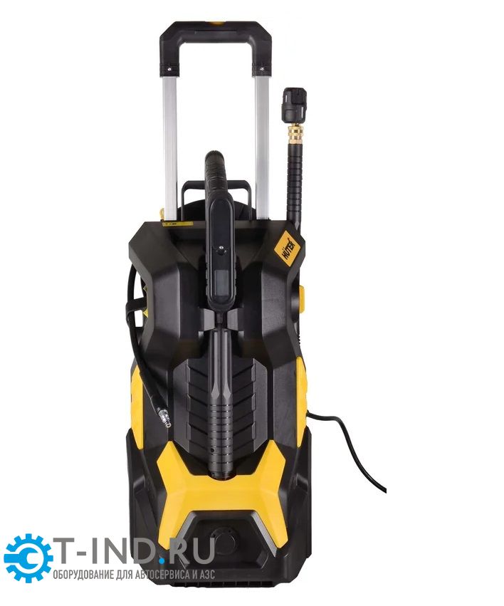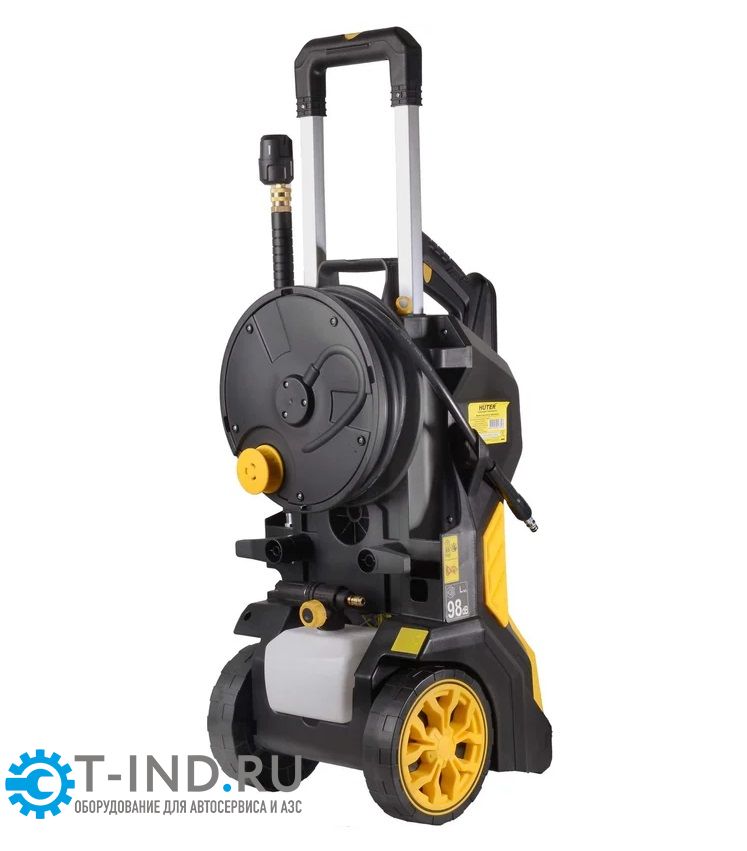 Профессиональный пеногенератор позволяет наносить моющие средства прямо на поверхность, улучшая качество очистки. Шланг длиной 10 метров обеспечивает свободу перемещения и доступ к удалённым объектам. Удобный механизм для намотки длинного шланга на барабан облегчает хранение и транспортировку оборудования. Колёса и удобная ручка делают перемещение мойки лёгким и безопасным.