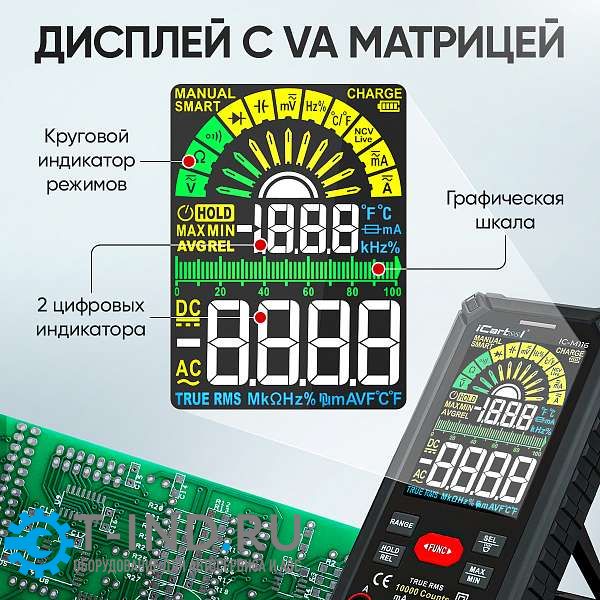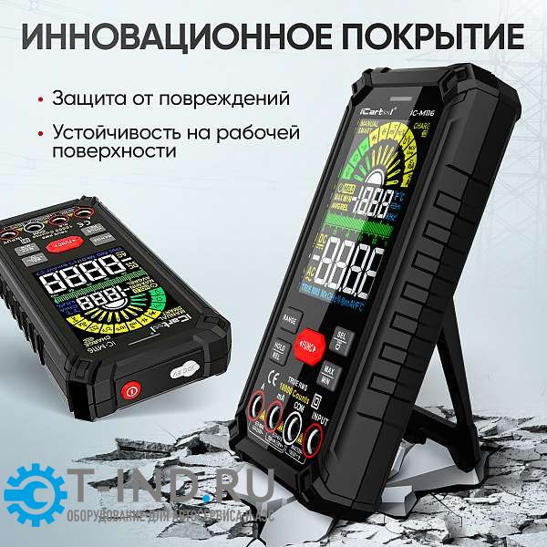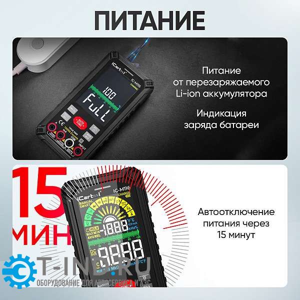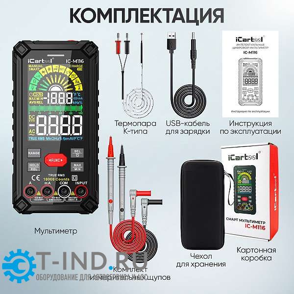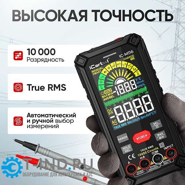 Интеллектуальный цифровой мультиметр IC-M116 — это надежный профессиональный инструмент с автоматическим выбором режима измерения, встроенным Li-ion аккумулятором и множеством дополнительных функций. Он оснащен высококонтрастным цветным дисплеем с VA-матрицей, обеспечивающим четкость отображения данных. Мультиметр соответствует высокому классу электробезопасности CAT III 1000В и CAT IV 600В, обеспечивая надежную защиту при работе с высокими напряжениями. Показания этого мультиметра будут максимально точными благодаря измерению истинных среднеквадратичных значений (True RMS).