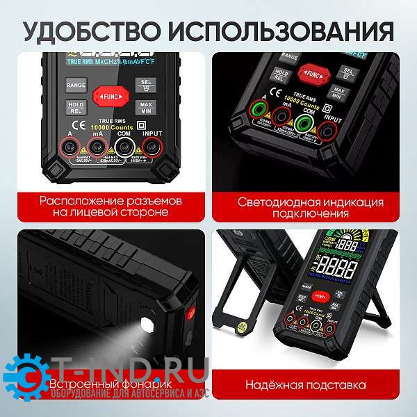 В зависимости от выбранного режима измерения разъемы щупов подсвечиваются с целью правильного подключения к ним. Подставка позволяет удобно разместить прибор на поверхности. Корпус с инновационным прорезиненным покрытием предохраняет от повреждений и обеспечивает защиту от поражения электрическим током. В комплект входят высококачественные мягкие и гибкие щупы, термопара, оригинальный защитный чехол-переноска и USB-кабель для зарядки.