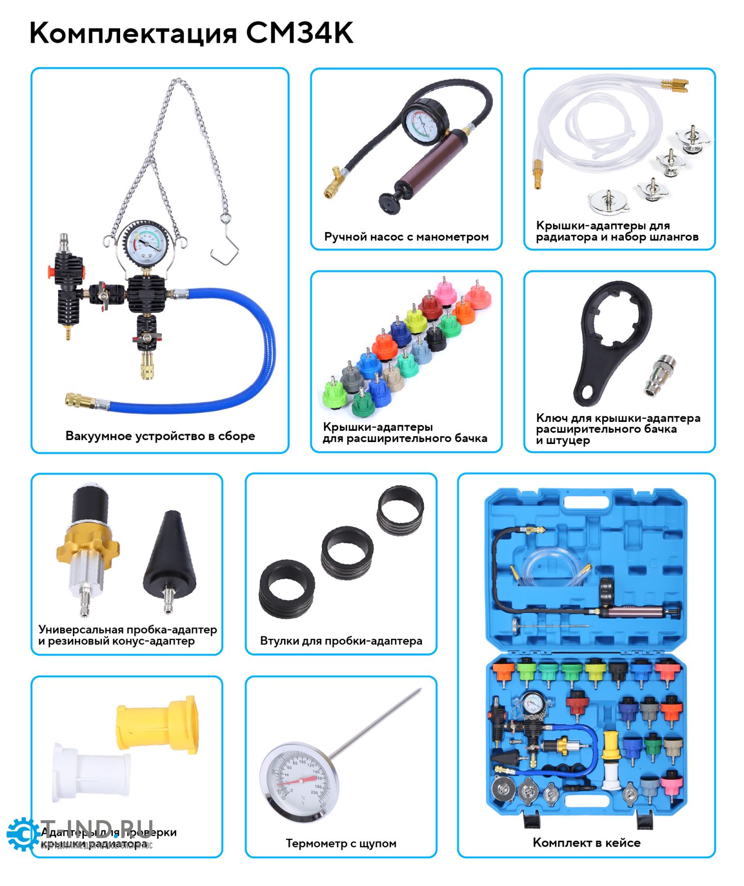 NORDBERG CM34K — профессиональный набор для проверки и заправки системы охлаждения. Предназначен для диагностики системы охлаждения автомобиля, проверки герметичности и замены охлаждающей жидкости. Подходит для большинства автомобилей европейского, американского и китайского производства.