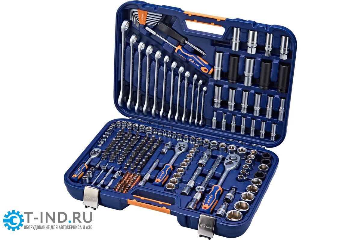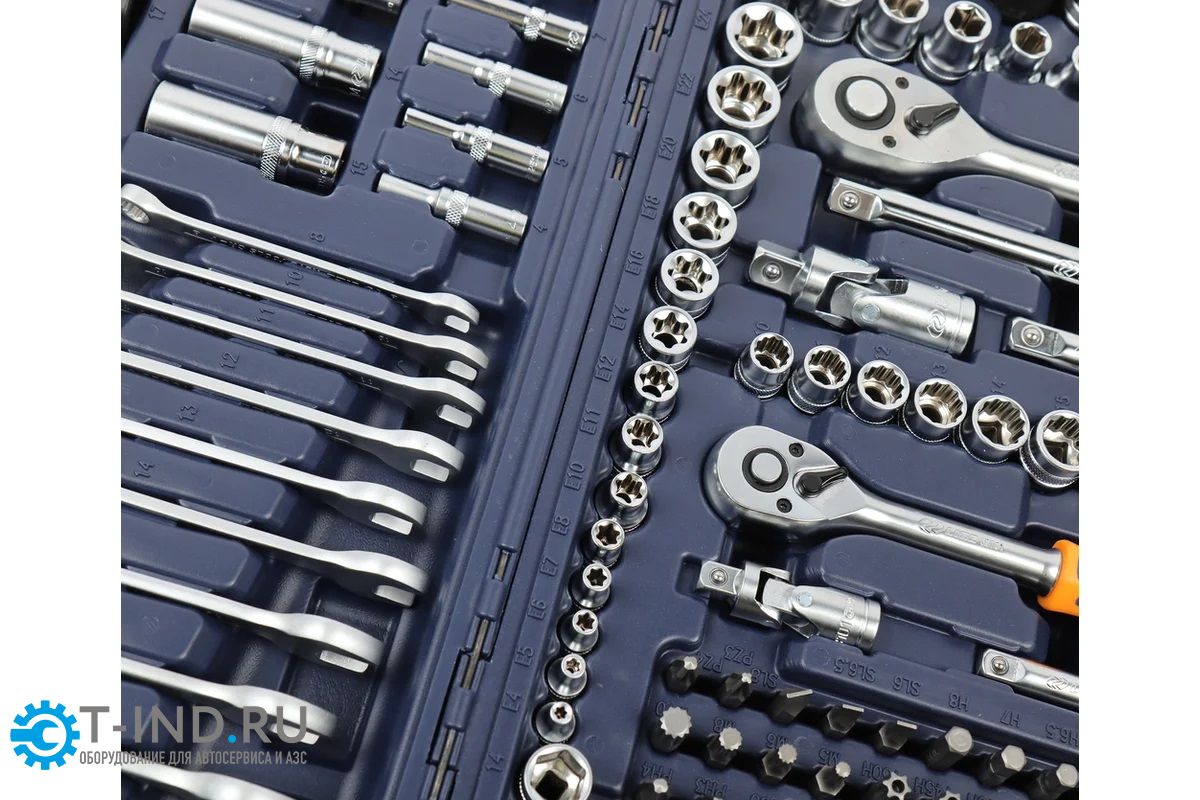 В наборе представлены различные типы головок, бит и ключей, что позволяет использовать его для ремонта большинства моделей автомобилей. Посадочный квадрат составляет 3/8", 1/2" и 1/4", а тип головок — 6-гранные, 12-гранные, Е-профиль, короткие и глубокие.