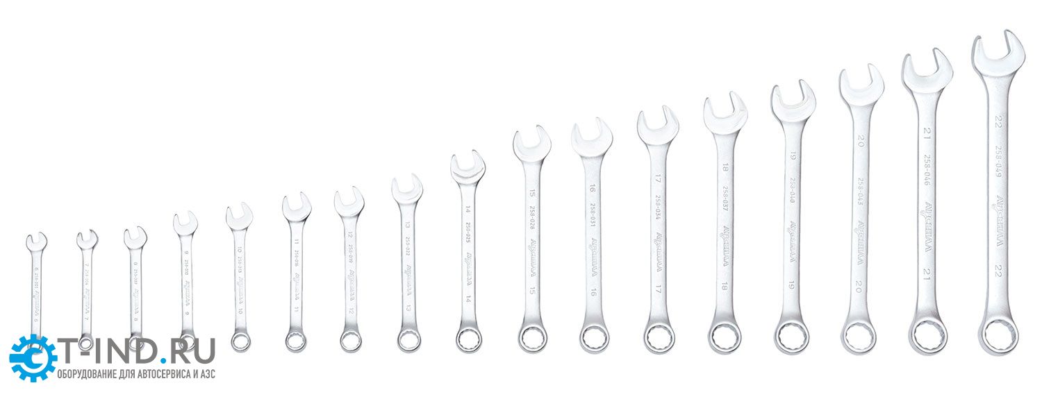 17 комбинированных ключей с размерами 6, 7, 8, 9, 10, 11, 12, 13, 14, 15, 16, 17, 18, 19, 20, 21, 22 мм