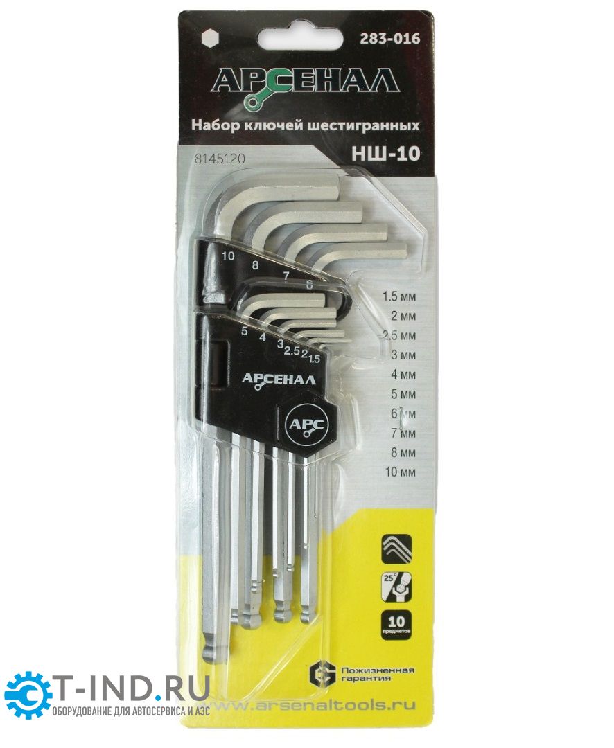 Набор шестигранников Арсенал НШ-10 это комплект из 10 шестигранных ключей Г-образной формы с шаровым профилем. Набор рекомендуется к применению при сборке мебели, ремонте автомобиля в тех случаях, когда требуется отвернуть крепеж имеющих шестигранный шлиц. В комплект входят 10 ключей разного размера. Шестигранники Г-образные с шаровым профилем (1.5; 2; 2.5; 3; 4; 5; 6; 7; 8; 10 мм)
