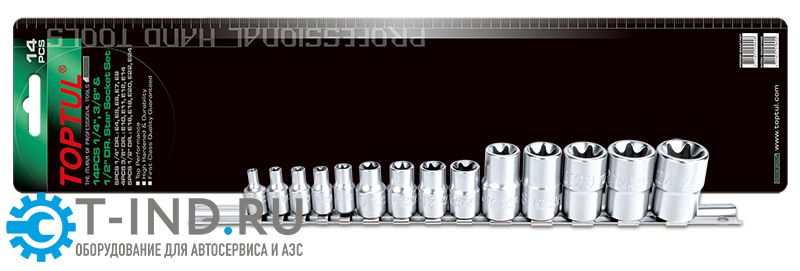 Набор торцевых головок 1/4", 3/8", 1/2" E4-E24, 14 предметов на планке TOPTUL