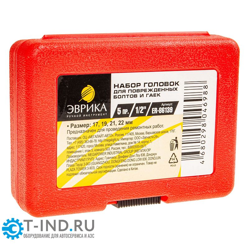 Набор головок для поврежденных болтов и гаек ЭВРИКА ER-86139, 1/2", 17-22мм, 5пр.