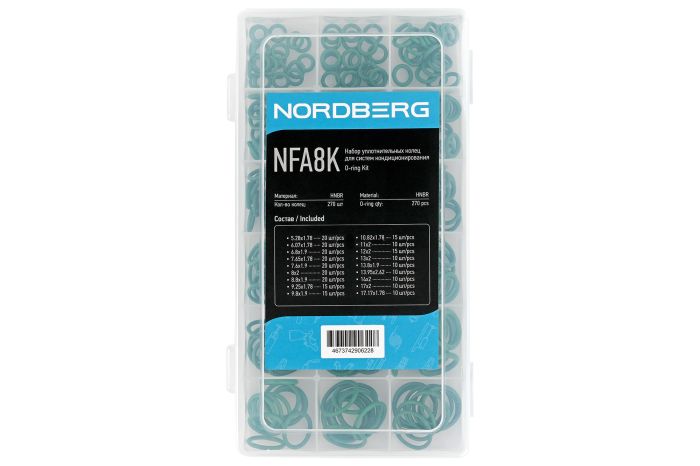 Набор уплотнительных колец NORDBERG NFA8K в пластиковом кейсе с ячейками используется для герметизации узлов системы кондиционирования автомобиля, а также для подвижных и неподвижных гидравлических, пневматических, топливных и смазочных узлов автотранспорта.