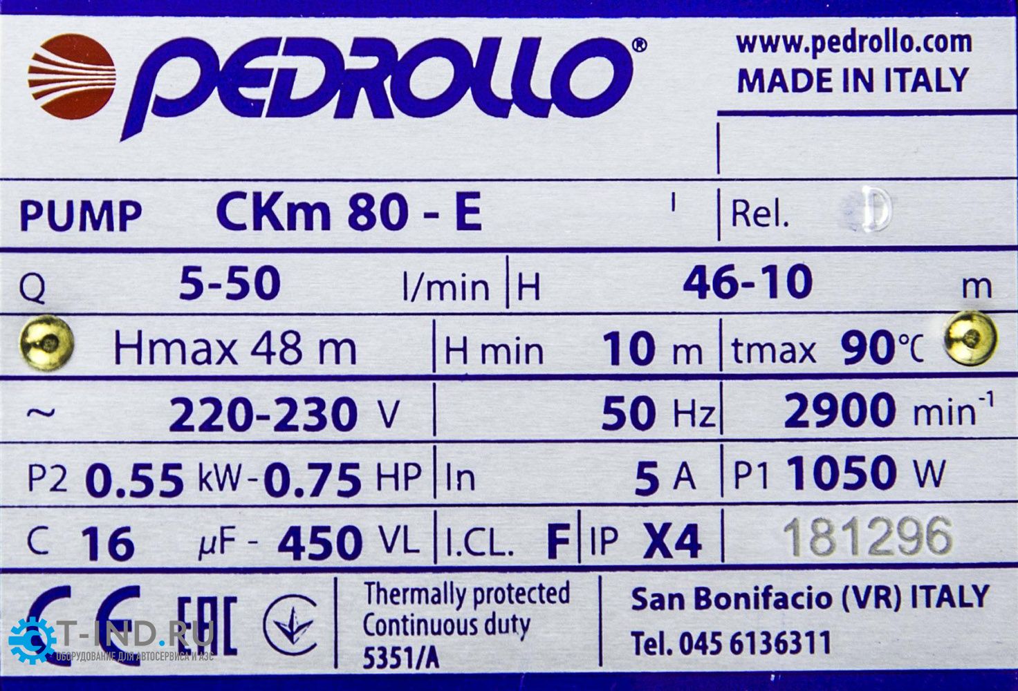 Жидкостно-кольцевой самовсасывающий поверхностный электронасос Pedrollo CKm-80 рекомендуется для перекачки чистой воды, дизельного топлива, мазута без наличия абразивных частиц и химически неагрессивных жидкостей. Подача насоса до 3 м3/час, а максимальный напор составляет 46 м вод. ст. Оборудован однофазным двигателем со встроенным аварийным выключателем. Рабочая точка (оптимальный режим работы): производительность 25 литров в минуту, 3 атмосферы давления.