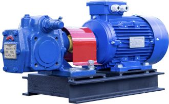 Промышленный насосный агрегат нашего производства НМШ 8-25-6,3/10 с 4 кВт подаёт в номинальном режиме 105 литров жидкого масла в час, создавая при этом напор 100 метров. Агрегат состоит из голой насосной части и общепромышленного электродвигателя 4х1500 лапы, соединённых между собой гибкой муфтой (находится под красным защитным кожухом). Всё смонтировано на стальной раме.