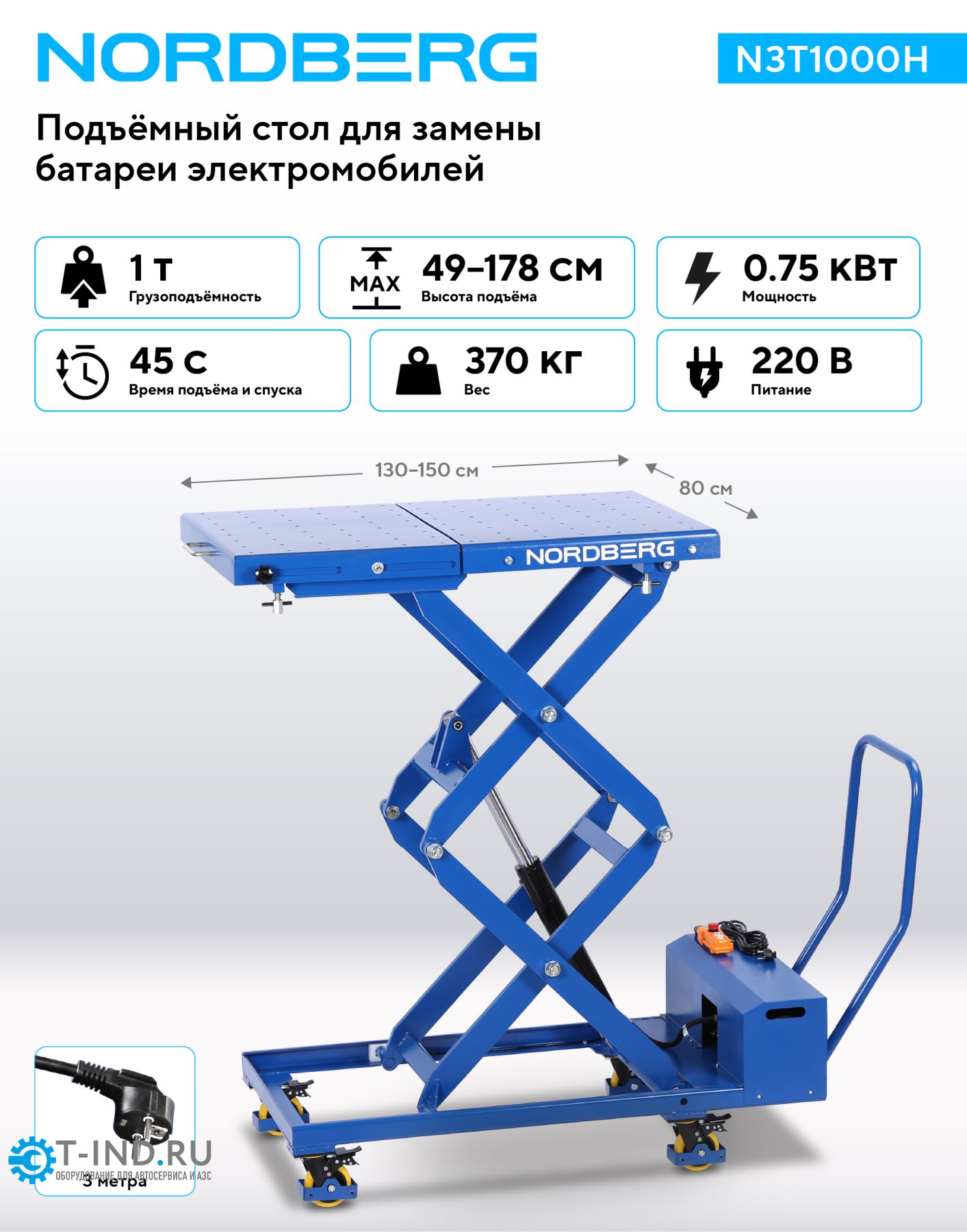 NORDBERG N3T1000H — электогидравлический подъёмный стол для АКБ электромобилей, грузоподъёмностью 1000 кг. Предназначен для безопасного перемещения и удержания габаритных и тяжеловесных узлов электромобилей при выполнении монтажных и демонтажных работ, обслуживания и замены. Обеспечивает точное позиционирование, снижает физические нагрузки на персонал и значительно ускоряет процесс ремонта.